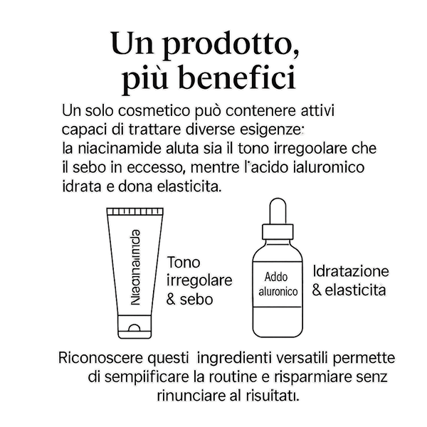 Scegliere la skincare non significa necessariamente riempire il beauty case di tanti prodotti diversi. A volte un’unica formula ben studiata può affrontare più problematiche insieme: ad esempio, un siero con niacinamide può migliorare sia il tono irregolare sia l’eccesso di sebo, mentre l’acido ialuronico aumenta al tempo stesso idratazione ed elasticità. La chiave è saper riconoscere quali principi attivi sono versatili e scientificamente validati per risolvere più esigenze. Così risparmi tempo, riduci i costi e semplifichi la routine senza rinunciare ai risultati. Con Skincare Zone ricevi suggerimenti di prodotti studiati per affrontare più esigenze cutanee contemporaneamente.